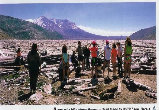 | Onlookers view the floating logs, most of which had been toppled during the original eruption steam blast, and then carried into the Lake by the 800 - 900 foot wave or waves created by the eruption landslide in 1980. |